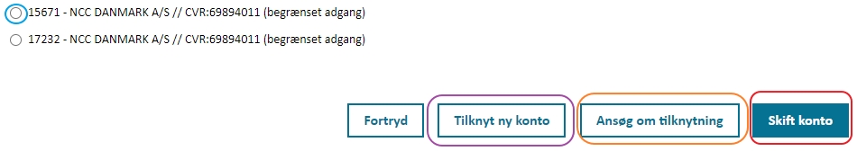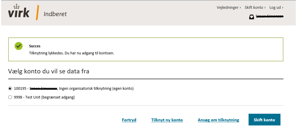 Når du har fået oprettet en adgang til en anden konto, vil denne fremgå i oversigten, når du klikker på Skift konto øverst i menuen. Her kan du vælge den konto, du vil arbejde med.