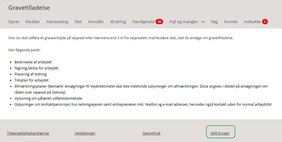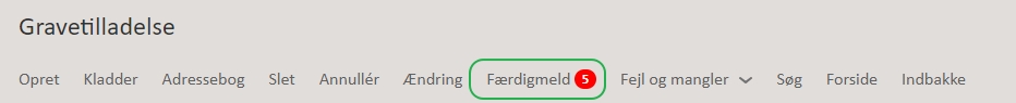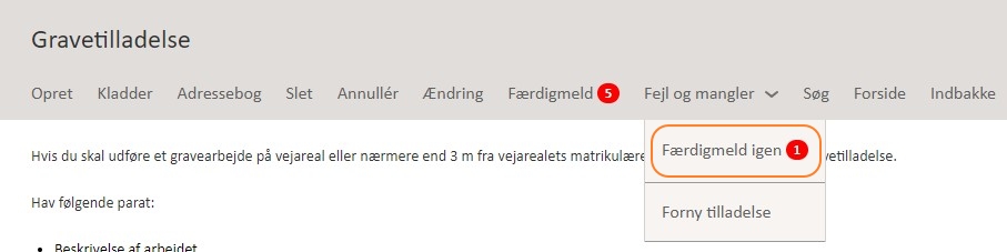 Tryk på Ansøg om Gravetilladelse og du kan i menuen vælge Færdigmeld eller Fejl og Mangler -> Færdigmeld igen, hvis det er en sag, der er blevet afvist af vejmyndigheden