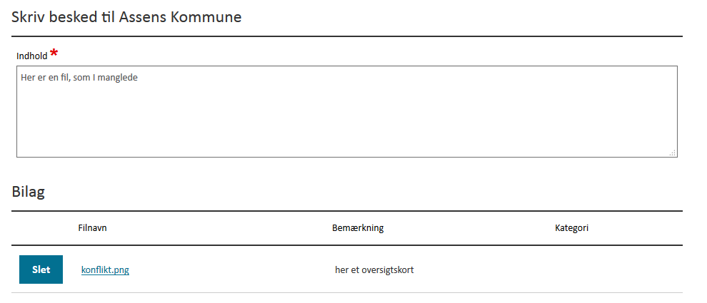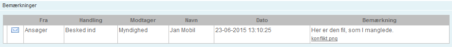 Ansøger finder og åbner sagen og skriver en besked til myndigheden (vedhæfter eventuelt en fil):